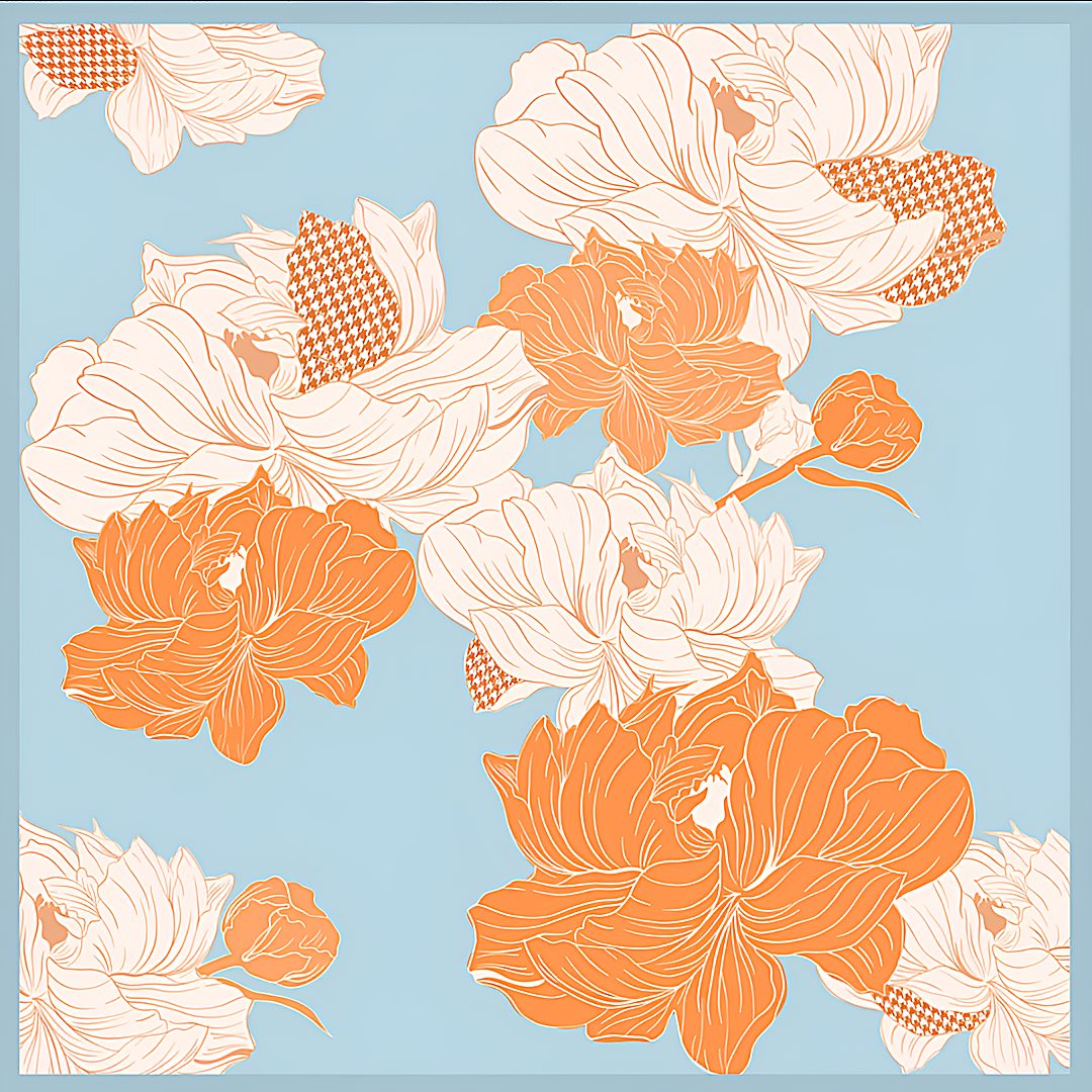 Платок 100% шелк (креп-сатин / атлас, сорт Малберри, 14 момми), ручной подгиб края, размер до 87×87 см (1−3 см допуск по ГОСТу на подгиб).